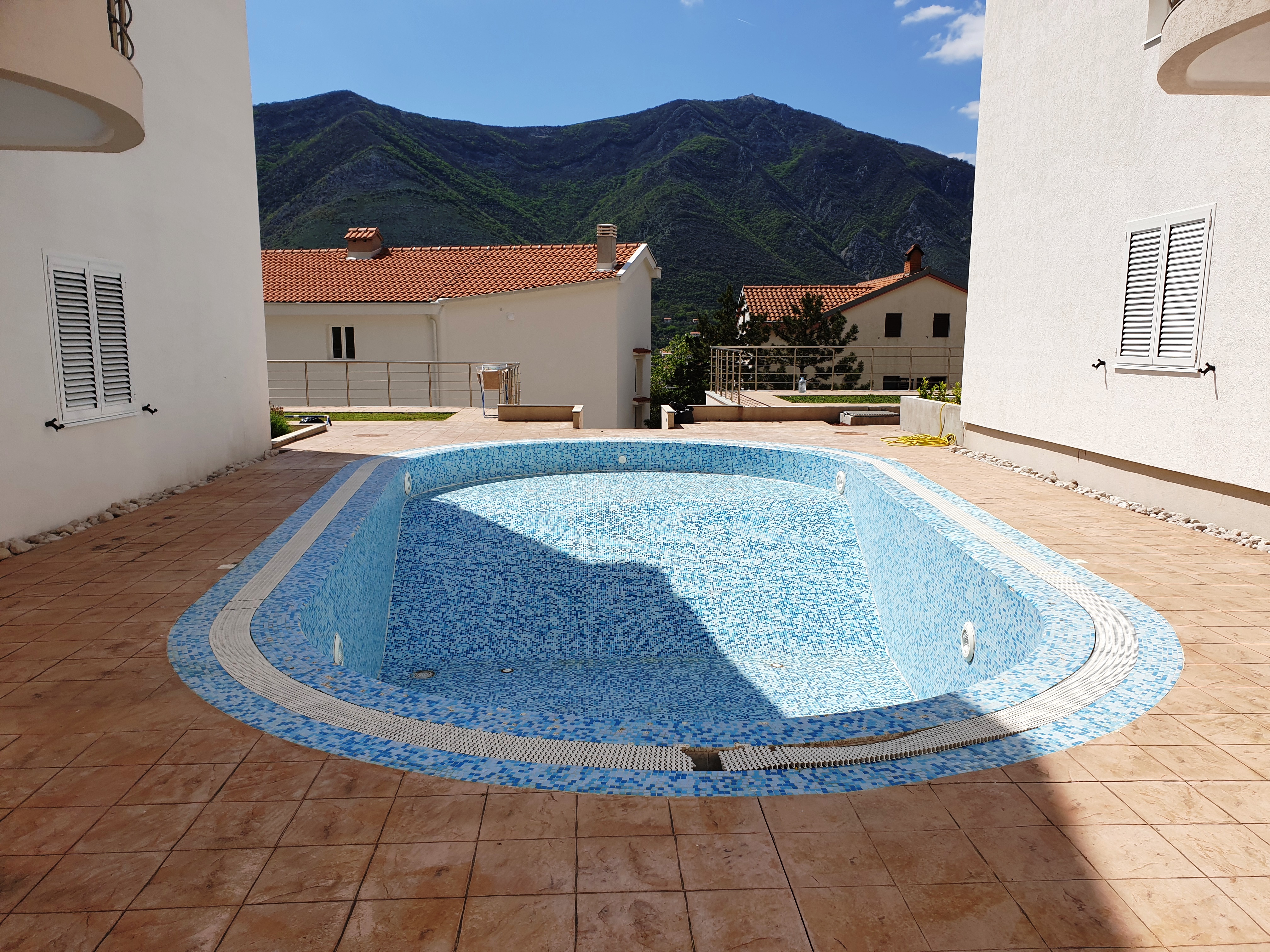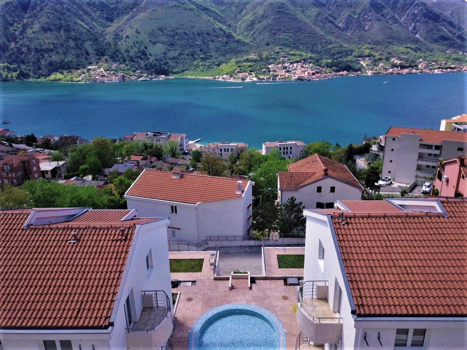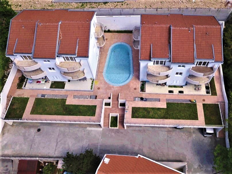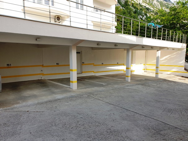 The building in which this apartment is situated is located in a residential complex of two buildings with a shared garden with a pool and covered parking close to the Huma Hotel in Dobrota.